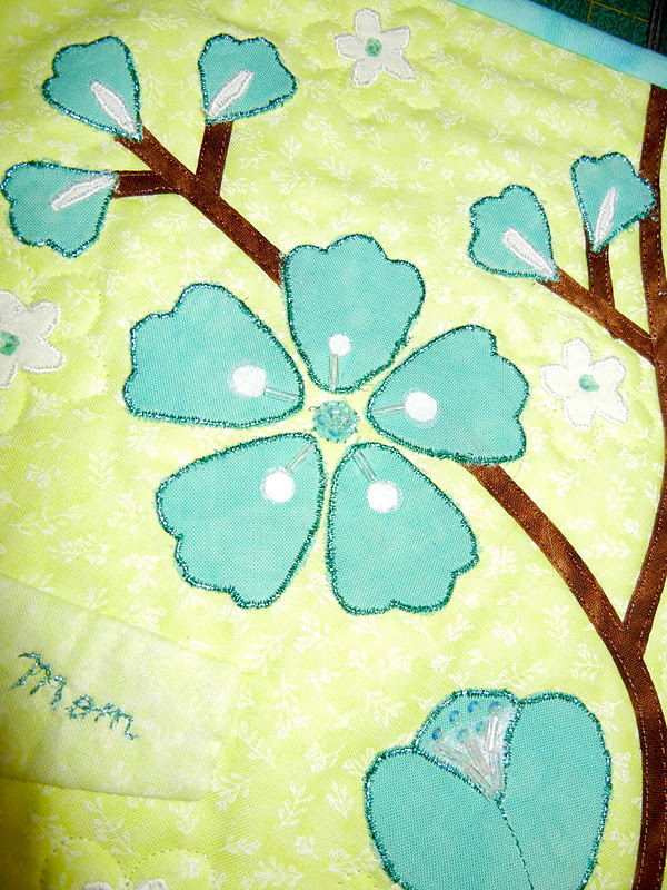 Above, you can see how the quilting in the white background changes the texture so entirely where it is quilted along the right edge of the picture but, not on the left.